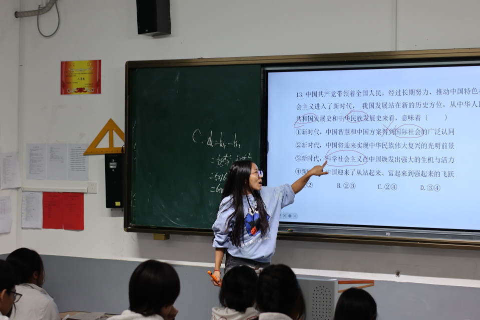后排角落,政治老师在黑板上圈画知识重点为第二天同学们的乘风破浪指明方向。