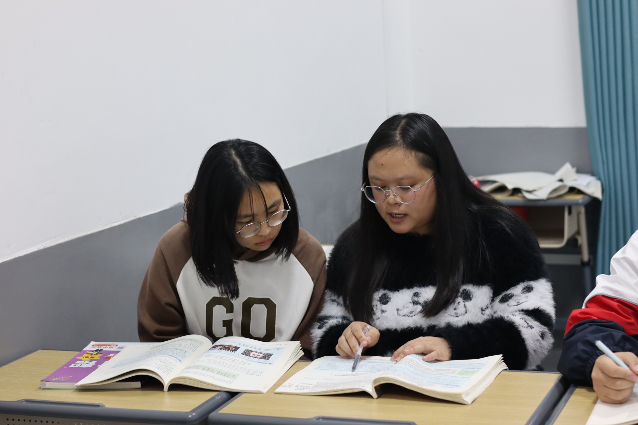 中间几排的同学自发组队,有人捧着课本互考古诗文默写,有人对着错题集交流解题思路,偶尔的轻声讨论被笔尖摩挲声轻轻覆盖。